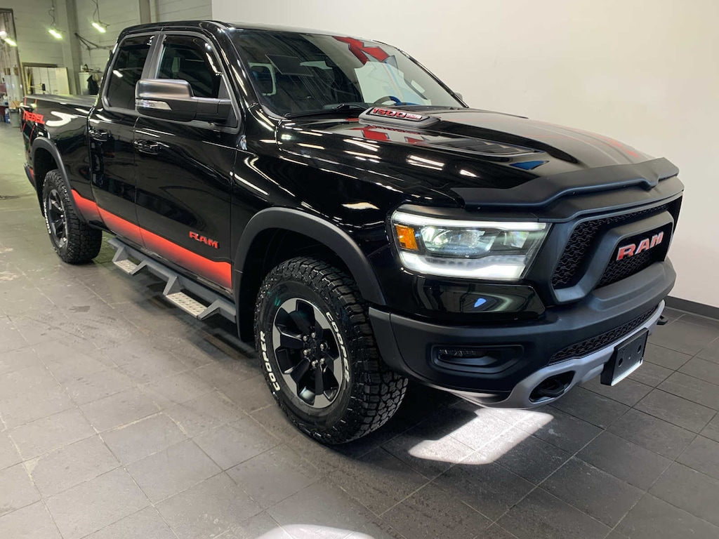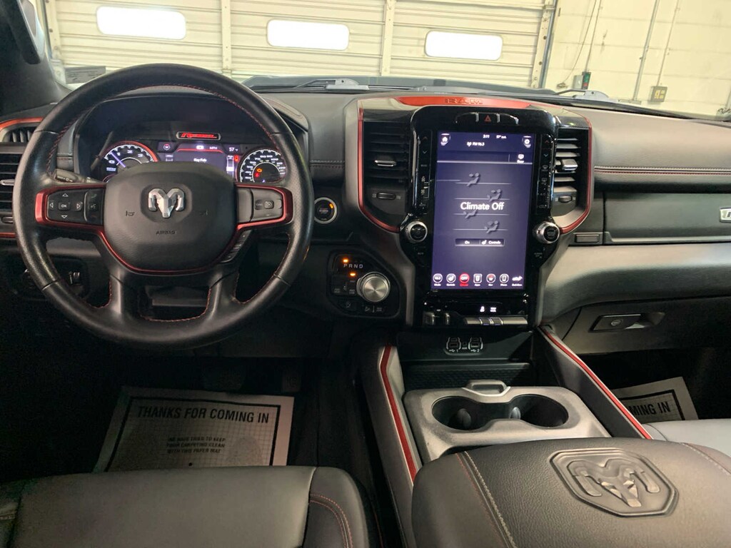 Google Android Auto®, SiriusXM Traffic Plus, USB Host Flip, Disassociated Touchscreen Display, HD Radio, Integrated Center Stack Radio, For Details, Visit DriveUconnect.com, 1-Yr SiriusXM Guardian Trial, 12 Touchscreen Display, GPS Navigation, SiriusXM Travel Link, 4G LTE Wi-Fi Hot Spot, SiriusXM w/360L, Apple CarPlay®, LED Footwell Lighting, Radio: Uconnect 4 w/8.4 Display, Rear Window Defroster, Universal Garage Door Opener, Heated Front Seats, Power Adjustable Pedals, Heated Steering Wheel, Foam Bottle Insert (Door Trim Panel), Black Premium Power Mirrors, Sun Visors w/Illuminated Vanity Mirrors, Active Noise Control System, Heavy Duty Engine Cooling, Dual Exhaust w/Black Tips, GVWR: 7,100 lbs, HEMI badge, 26 Gallon Fuel Tank, 9 AMPLIFIED SPEAKERS W/SUBWOOFER, TRANSMISSION: 8-SPEED AUTOMATIC (8HP75). Ram Rebel with Diamond Black Crystal Pearlcoat exterior and Red/Black interior features a 8 Cylinder Engine with 305 HP at 6400 RPM*. New Tires Nice